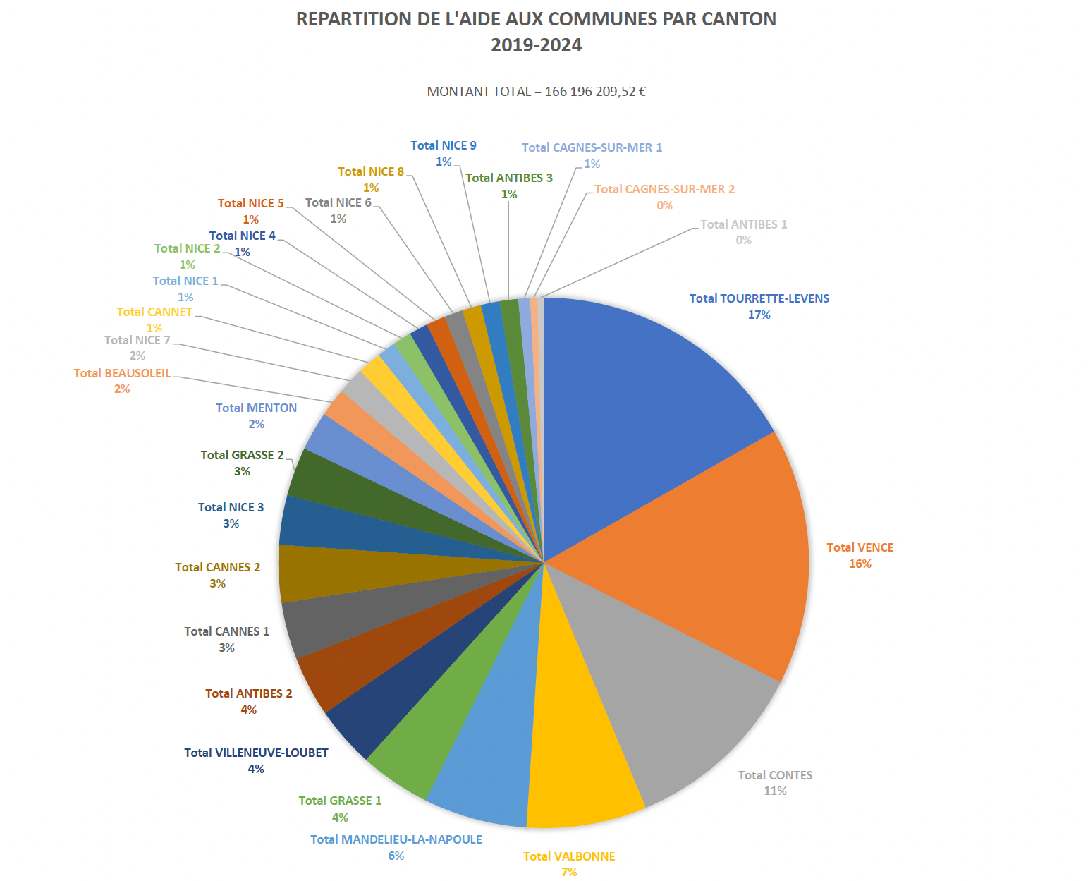 Si on fait une répartition par canton des aides aux communes attribuées par le Département, on s’aperçoit que, par exemple, entre 2019 et 2024, c’est le canton d’Éric Ciotti qui bénéficie de la part la plus importante des subventions avec 17% du budget, suivi du canton de Charles Anges Ginesy, plus de 16% du budget.